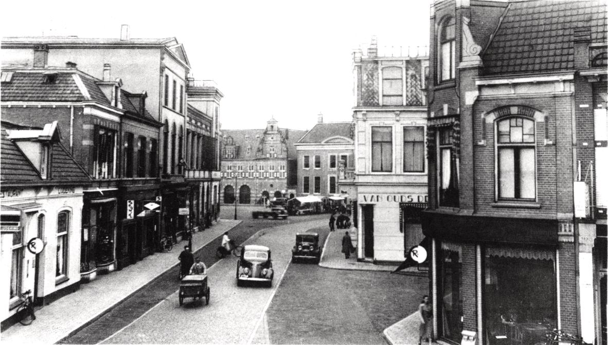 van links naar rechts, pakhuis van D. Polak, Hospers papier, -?- , hotel "van ouds de prins" en het kantongerecht.